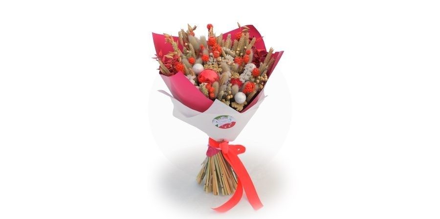 Зимний букет создан для того, чтобы быть подаренным в холодные зимние месяцы. Яркая упаковка, новогодние украшения и шишки, состав сухоцветов подчеркивают его назначение.