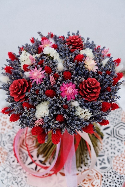 Акцентами в букете является гелихризум и шишка, он же придает яркость букету. Лавандин придает букету аромат. Цветовую гамму букета можно изменить.