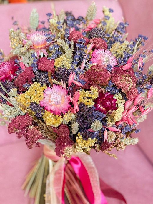 Яркий но в тоже время нежный букет из сухоцветов. Акцентами данного букета служит тысячелистник и гелихризум. Невероятный аромат придает синий лавандин.