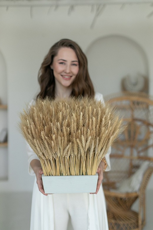 Композиция из сухоцветов в деревянном кашпо в интерьере будет смотреться современно и стильно. Пшеница подойдет под любой интерьер, так как имеет нейтральную цветовую гамму. Такая композиция не требует полива, ухода и полива.