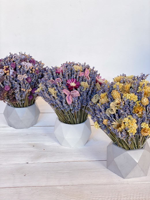 Небольшая композиция из лаванды в бетонном кашпо в интерьер.