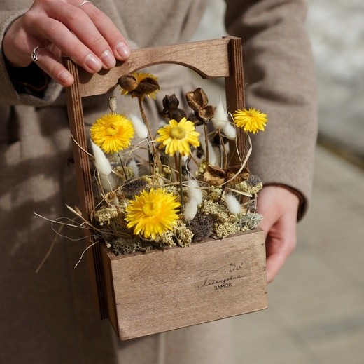 Композиция из сухоцветов в деревянном кашпо для дома.