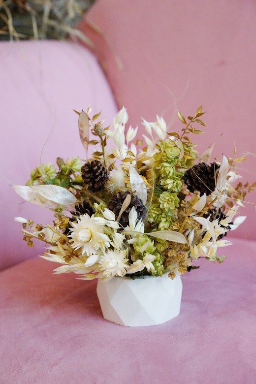 Небольшая композиция из сухоцветов. Такую композицию можно поставить дома или украсить столики кафе/ресторана. Сухоцветы идеально сочетаются друг с другом по цветовой гамме. Акцентами в этой композиции являются шишки. Гелихризум и овес придают нежность. Лунария добавляет волшебства.