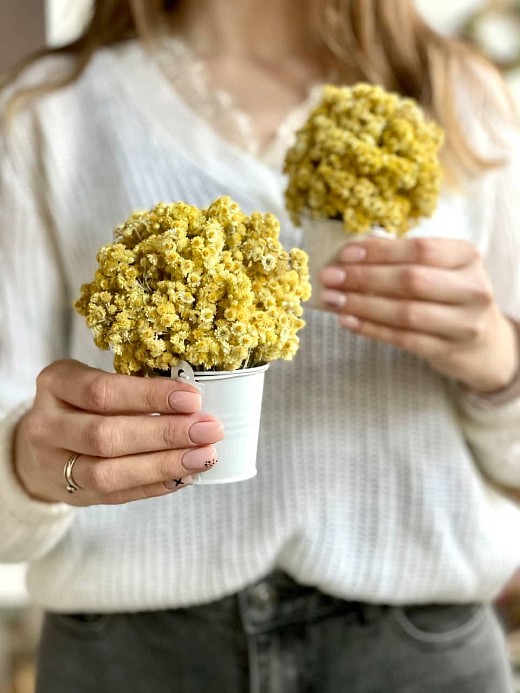 Нежное ведёрко из иммортеля в интерьер. Такое ведерко прекрасно подойдет для рабочего места. Благодаря не большому размеру оно отлично подойдет для стола и при этом не будет мешать. Украшайте красотой рабочее место и дарите радость не только себе но и окружающим.