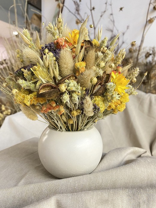 Сухоцветы под интерьер подобрать очень легко. Определитесь, какой цвет преобладает в вашем интерьере. С чем может сочетаться букет? Либо же выберите нейтральные цвета сухоцветов. Чтобы букет дополнял интерьер, но не выделялся. Так же вы можете скинуть фотографии места, куда бы вы хотели поставить букет или композицию. нам на WhatsApp. Наши флористы подберут лучший вариант и отправят вам подборку сухоцветов.