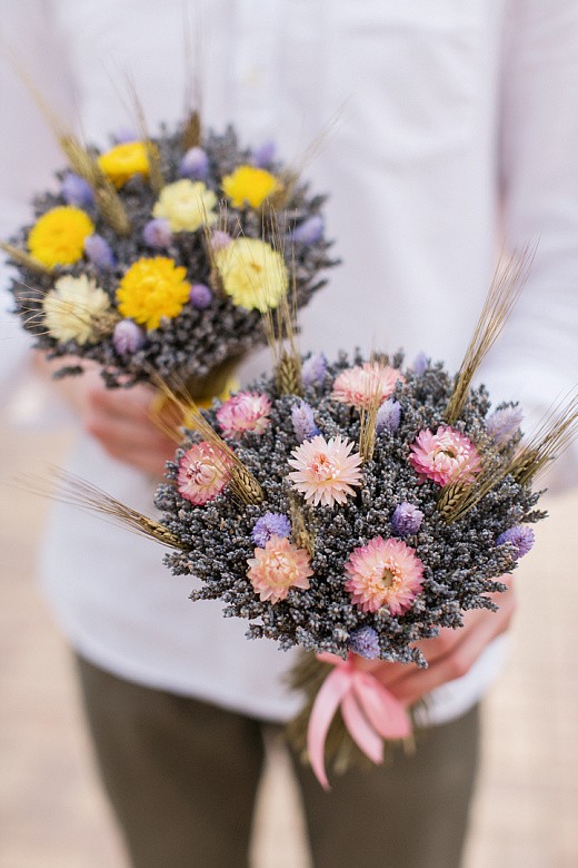 Яркий, ароматный букет из лавандина с гелихризумами и фалярисом. Акцентами в букете является гелихризум. Такой букет можно выполнить в любой цветовой гамме. Так же его можно собрать в виде композиции в бетонном или деревянном кашпо.