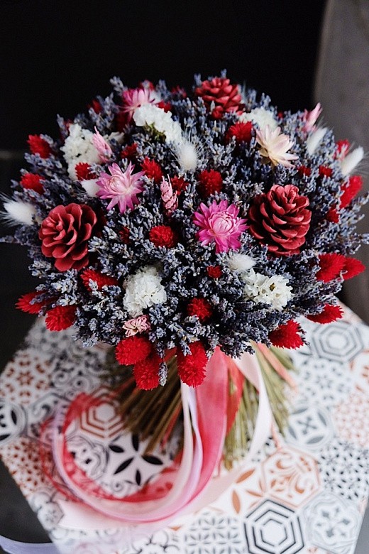 Яркий и в то же время ароматный букет из сухоцветов. Акцентами данного букета являются красные шишки и гелихризумы. Нежность букету придает лыгурус и статица.